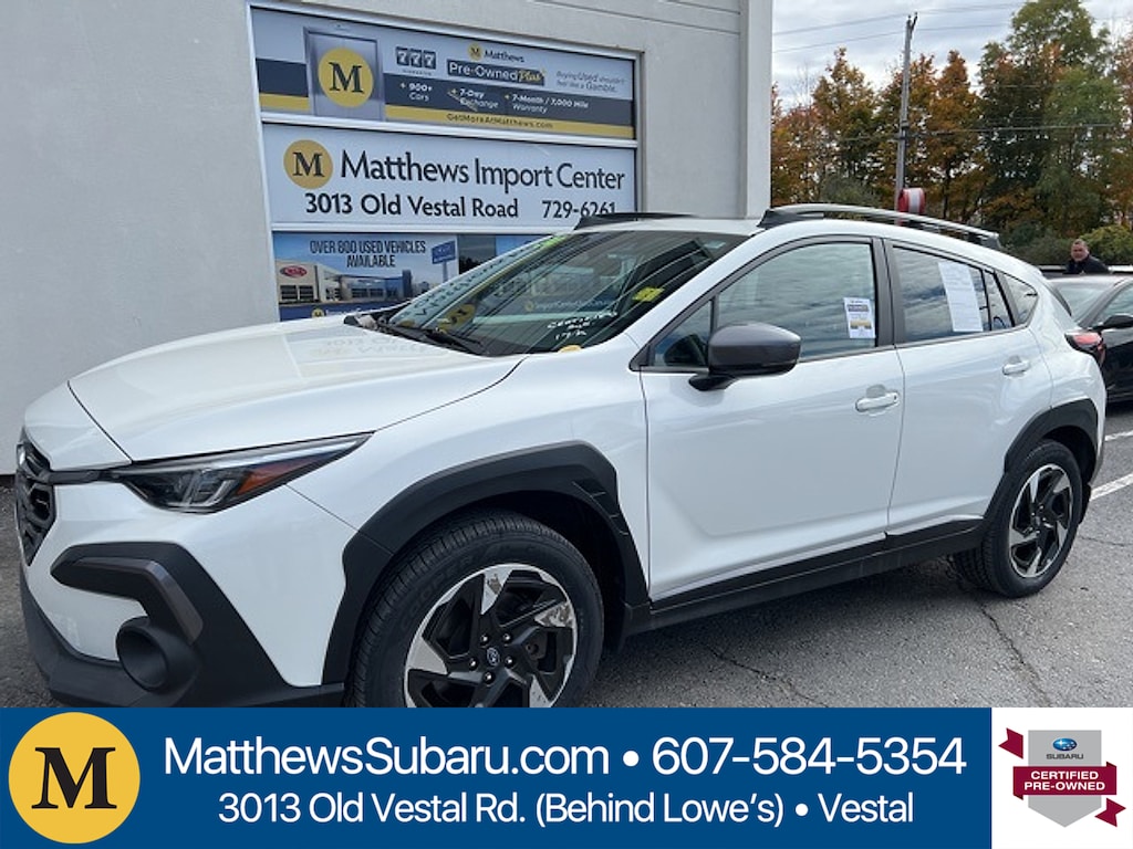 Matthews Import Center promises each customer a thorough and confident 120-point inspection on our used inventory guaranteeing a relaxing and peace-of-mind experience. We are located behind Lowes in Vestal NY. Or call us at (607) 729 - 6261Matthews Import Center3013 Old Vestal RoadVestal NY 13850. Certified. Crystal White Pearl 2024 Subaru Limited Crosstrek AWD Lineartronic CVT 2.5L 4-Cylinder DOHC 16V26/33 City/Highway MPGSubaru Certified Pre-Owned Details: * Powertrain Limited Warranty: 84 Month/100000 Mile (whichever comes first) from original in-service date * Vehicle History * 152 Point Inspection * SiriusXM 3-Month trial subscription $500 Owner Loyalty coupon & 1 year trial subscription to STARLINK * Roadside Assistance * Transferable Warranty * Warranty Deductible: $0