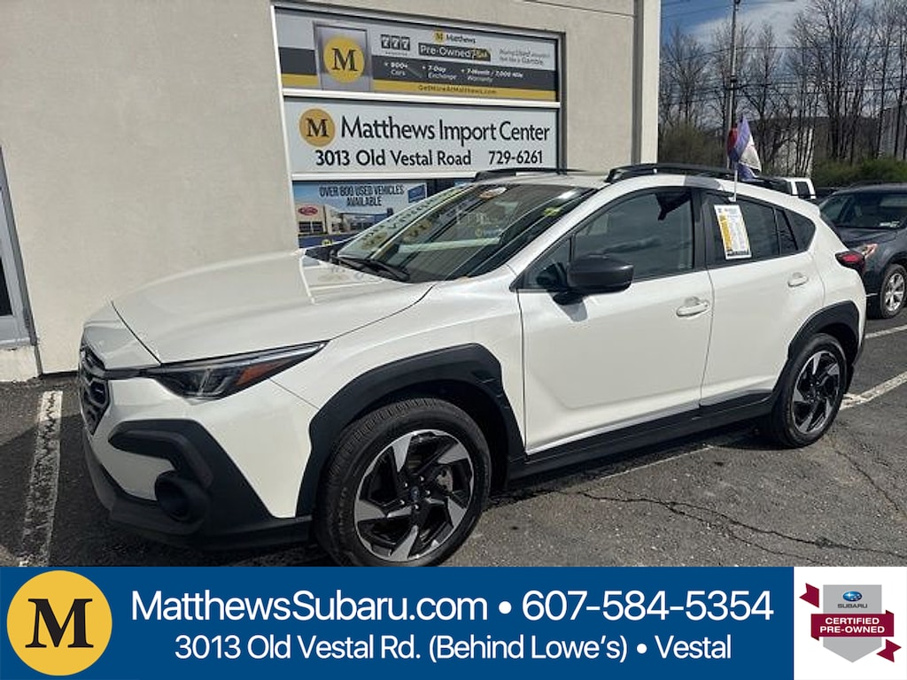 Matthews Import Center promises each customer a thorough and confident 120-point inspection on our used inventory guaranteeing a relaxing and peace-of-mind experience. We are located behind Lowes in Vestal NY. Or call us at (607) 729 - 6261Matthews Import Center3013 Old Vestal RoadVestal NY 13850. Certified. Crystal White Pearl 2025 Subaru Limited Crosstrek AWD Lineartronic CVT 2.5L 4-Cylinder DOHC 16V27/33 City/Highway MPGSubaru Certified Pre-Owned Details: * 152 Point Inspection * SiriusXM 3-Month trial subscription $500 Owner Loyalty coupon & 1 year trial subscription to STARLINK * Transferable Warranty * Powertrain Limited Warranty: 84 Month/100000 Mile (whichever comes first) from original in-service date * Vehicle History * Roadside Assistance * Warranty Deductible: $0