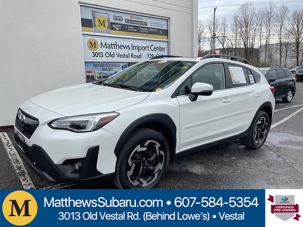 Certified. Crystal White Pearl 2021 Subaru Crosstrek Limited AWD Lineartronic CVT 2.5L DOHCRecent Arrival! 27/34 City/Highway MPGSubaru Certified Pre-Owned Details: * Warranty Deductible: $0 * 152 Point Inspection * Powertrain Limited Warranty: 84 Month/100000 Mile (whichever comes first) from original in-service date * Roadside Assistance * SiriusXM 3-Month trial subscription $500 Owner Loyalty coupon & 1 year trial subscription to STARLINK * Vehicle History * Transferable WarrantyAwards: * ALG Residual Value Awards Residual Value AwardsMatthews Import Center promises each customer a thorough and confident 120-point inspection on our used inventory guaranteeing a relaxing and peace-of-mind experience. We are located behind Lowes in Vestal NY. Or call us at (607) 729 - 6261 Matthews Import Center 3013 Old Vestal Road Vestal NY 13850.Odometer is 2188 miles below market average!
